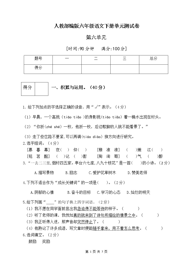 鸡娃题库圆满收官之作!人教部编版六年级语文下册第六单元测试卷(三)压轴登场,含答案可打印,免费下载!🎓