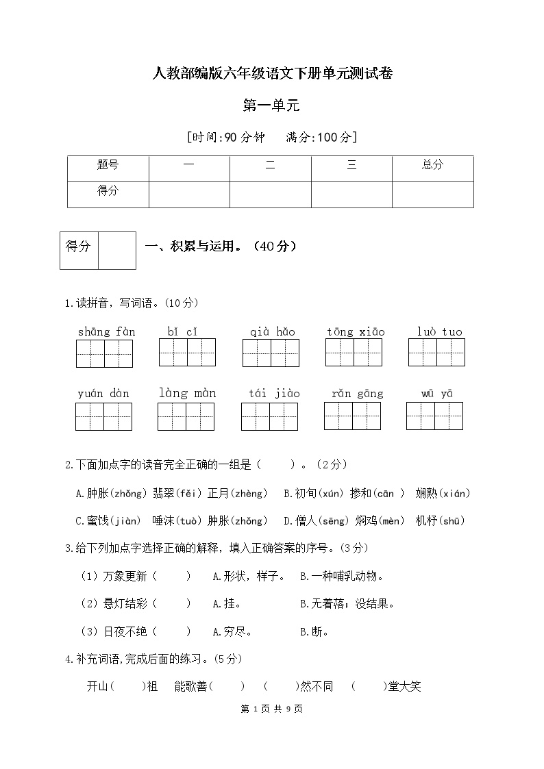 本套试卷严格依据人教部编版六年级语文下册第一单元教材内容编写,涵盖字词、句子、阅读、写作等多个板块,题目设计灵活,注重考查学生的综合语文素养。