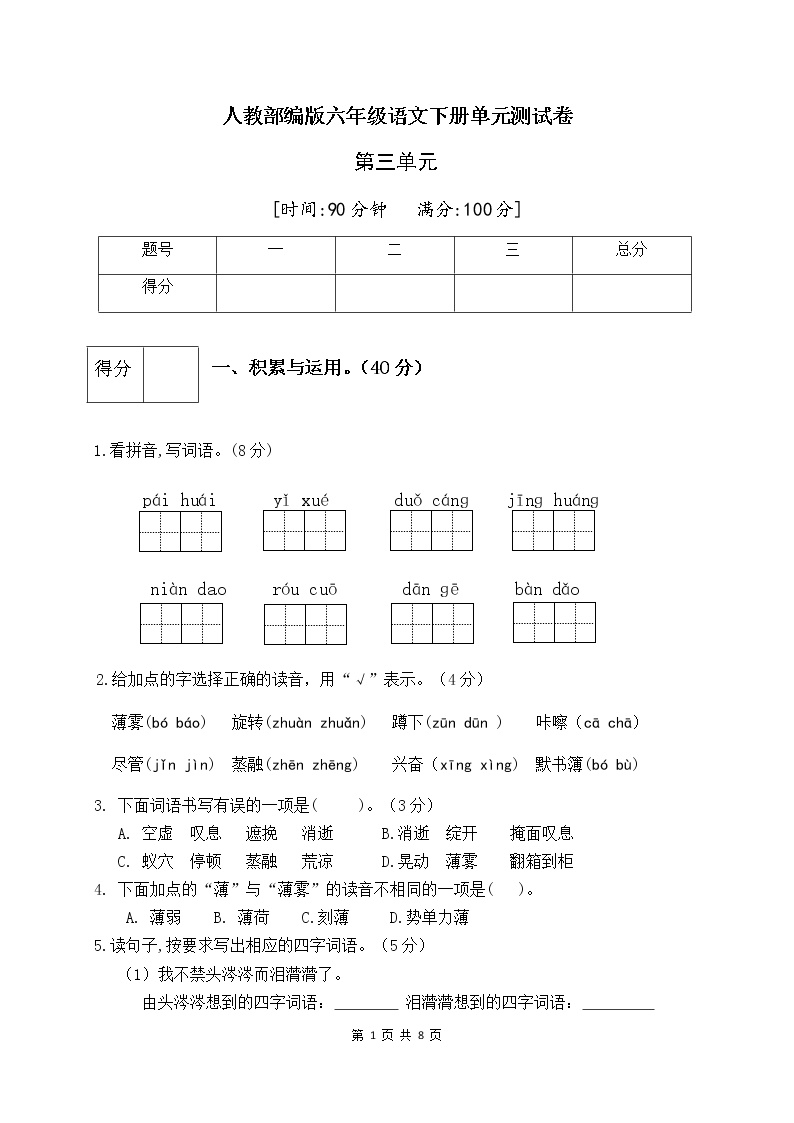 各位家长好!鸡娃题库(www.jiwatiku.cn)持续为您提供优质学习资源。本期推出的是人教部编版六年级语文下册第三单元测试卷(五),帮助孩子系统复习单元知识,提升语文应用能力。