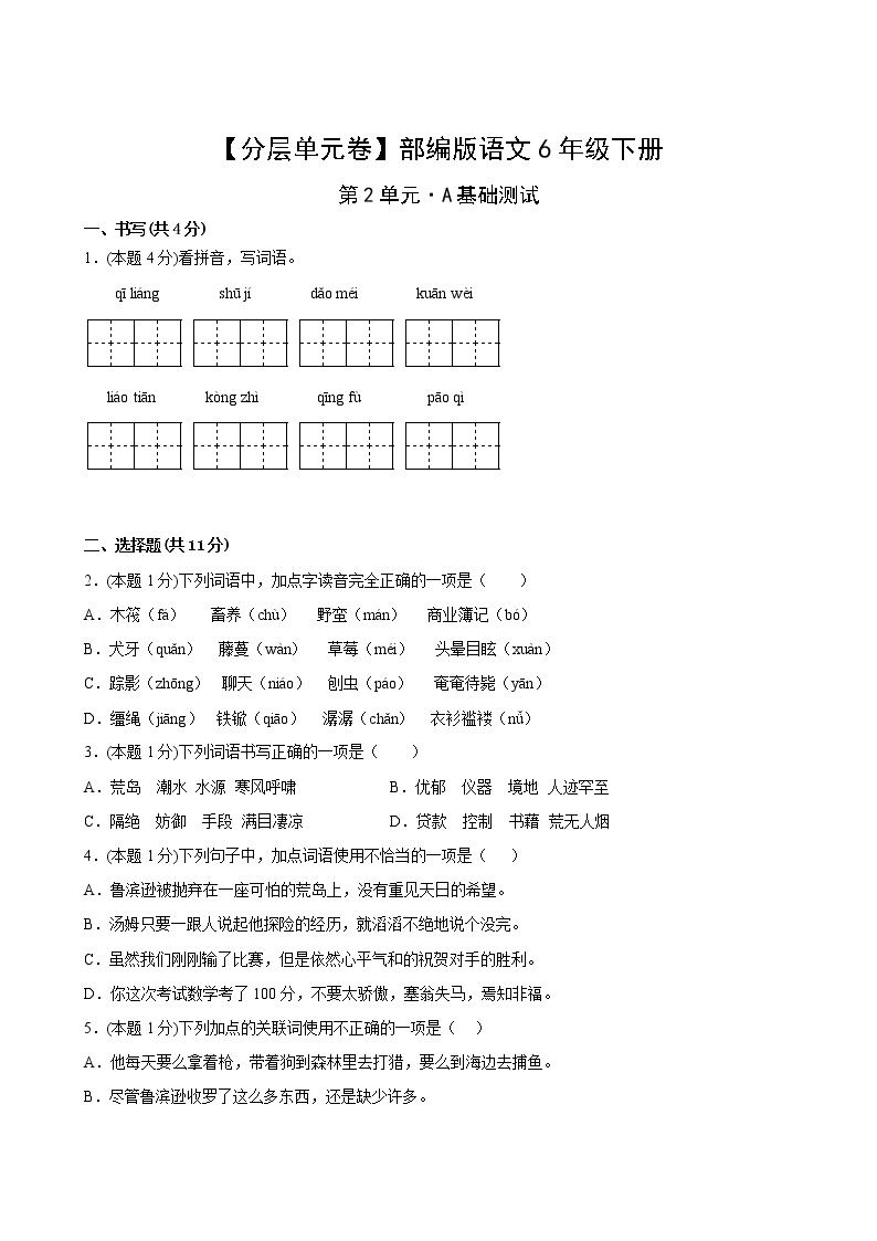 各位家长好!鸡娃题库(www.jiwatiku.cn)继续为您带来优质学习资源。本期分享的是部编版小学语文六年级下册第二单元A基础测试卷,这份试卷延续了A基础系列的特色,题目设计科学,难易度适中。