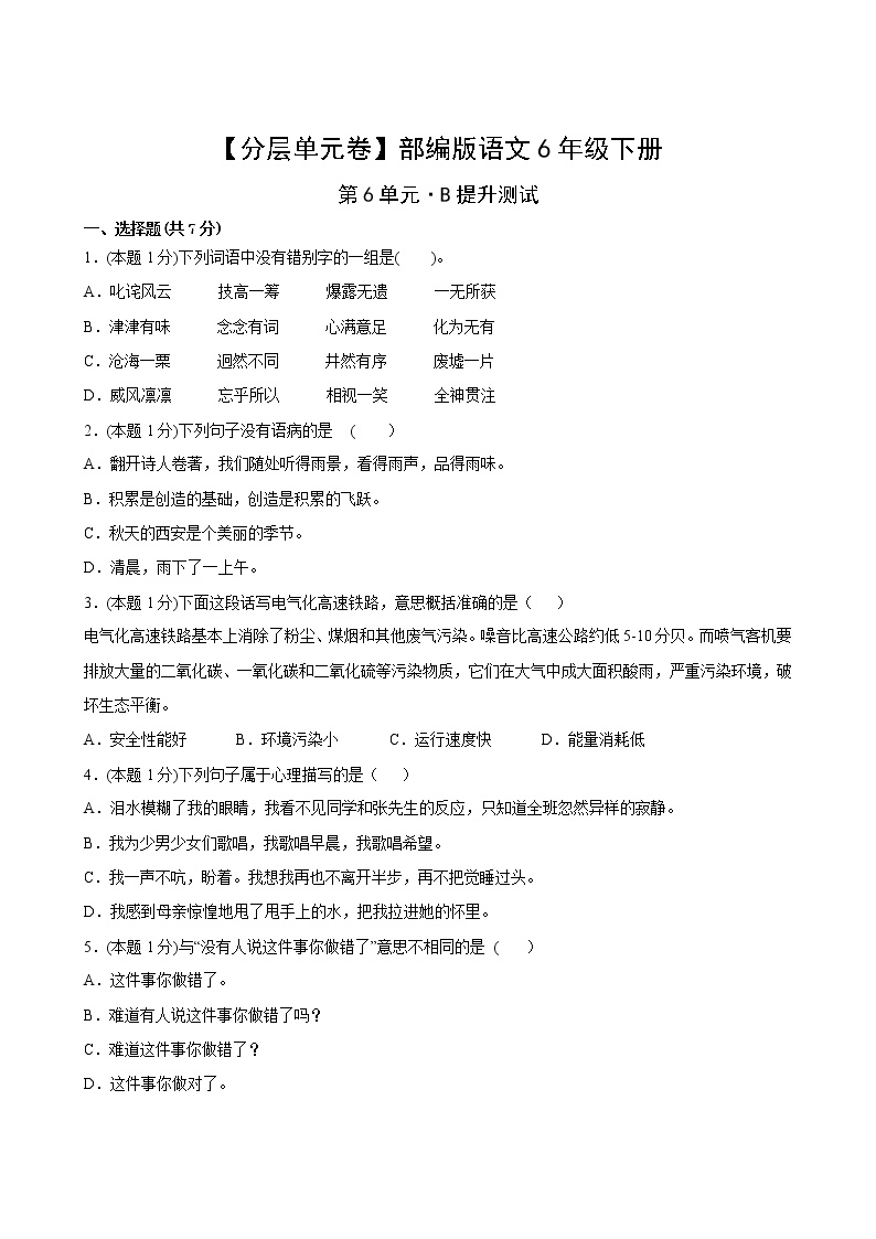 欢迎回到鸡娃题库(www.jiwatiku.cn)!本期我们分享的是部编版小学语文六年级下册第六单元B提升测试卷,这份试卷延续了B提升系列的特色,题目设计富有挑战性,适合学有余力的孩子使用。
