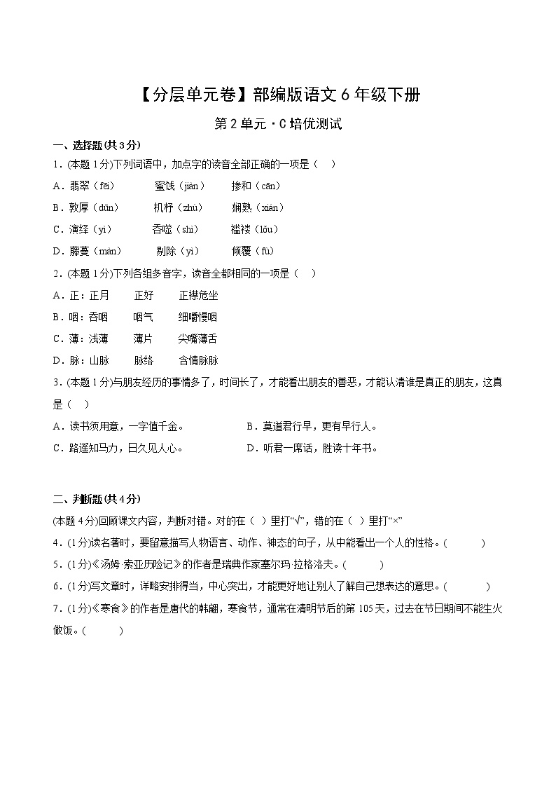 各位家长好!鸡娃题库(www.jiwatiku.cn)继续为您带来顶尖学习资源。本期分享的是部编版小学语文六年级下册第二单元C培优测试卷,这份试卷设计精良,题目具有相当的深度和广度。