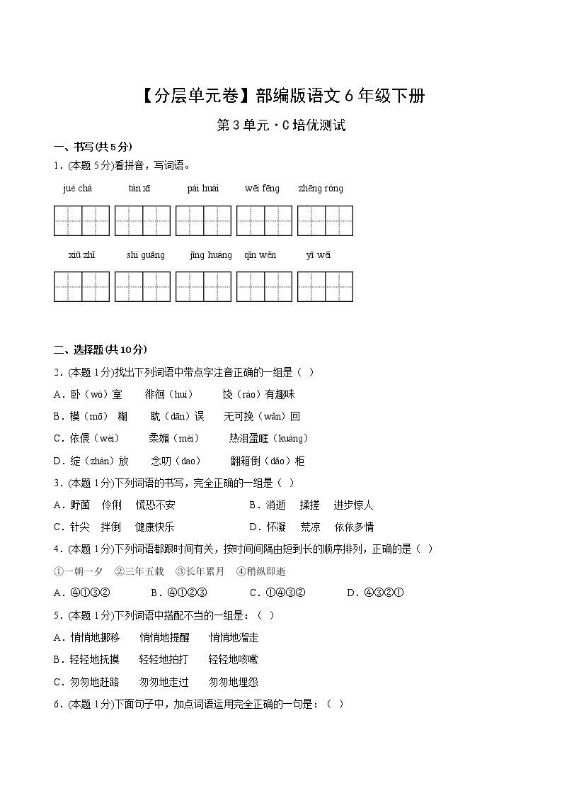 欢迎继续关注鸡娃题库(www.jiwatiku.cn)!今天我们为您准备了部编版小学语文六年级下册第三单元C培优测试卷,这份试卷汇聚了丰富的学习资源,题目设计独具匠心。