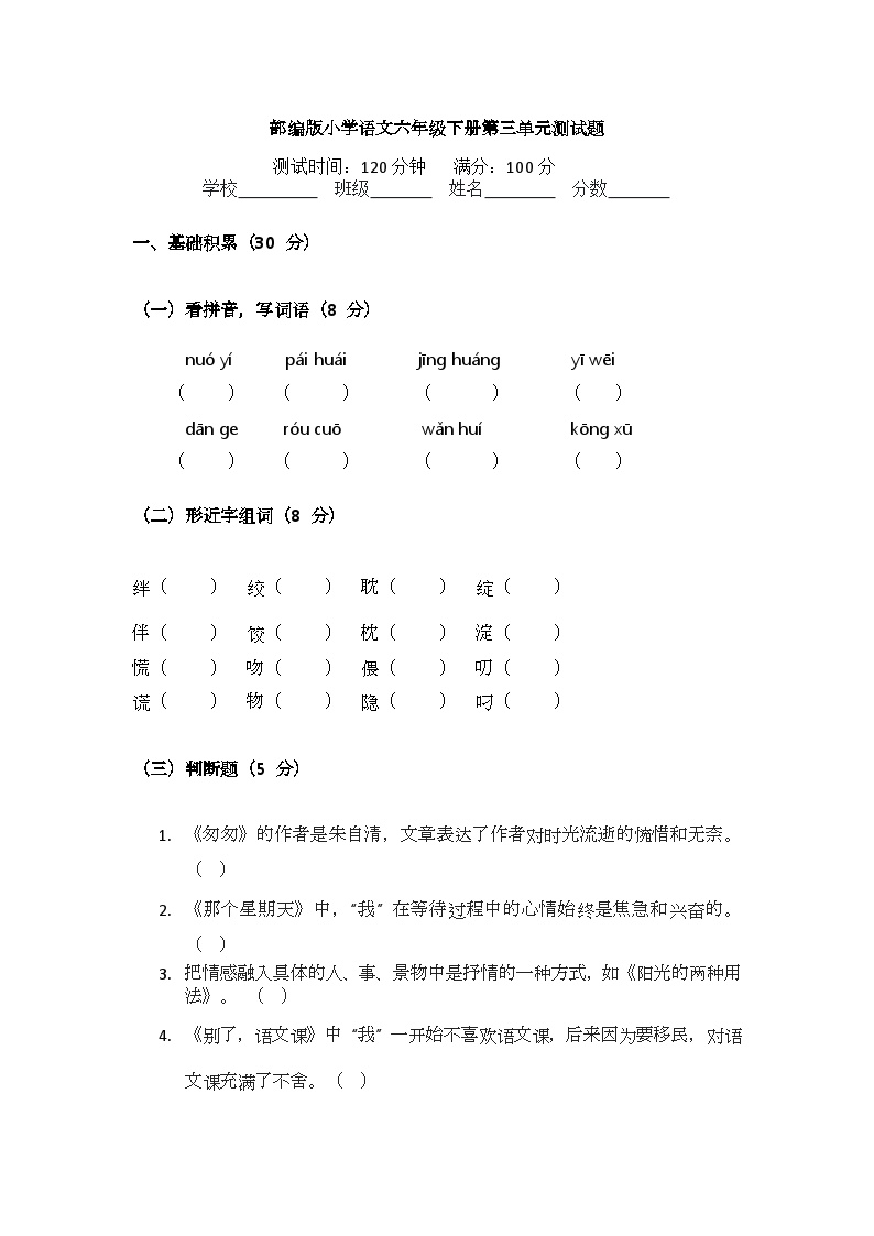 欢迎继续关注鸡娃题库(www.jiwatiku.cn)!今天我们为您准备了部编版小学语文六年级下册第三单元测试题,这份测试题内容丰富,设计科学,是检测学习效果的优质工具。