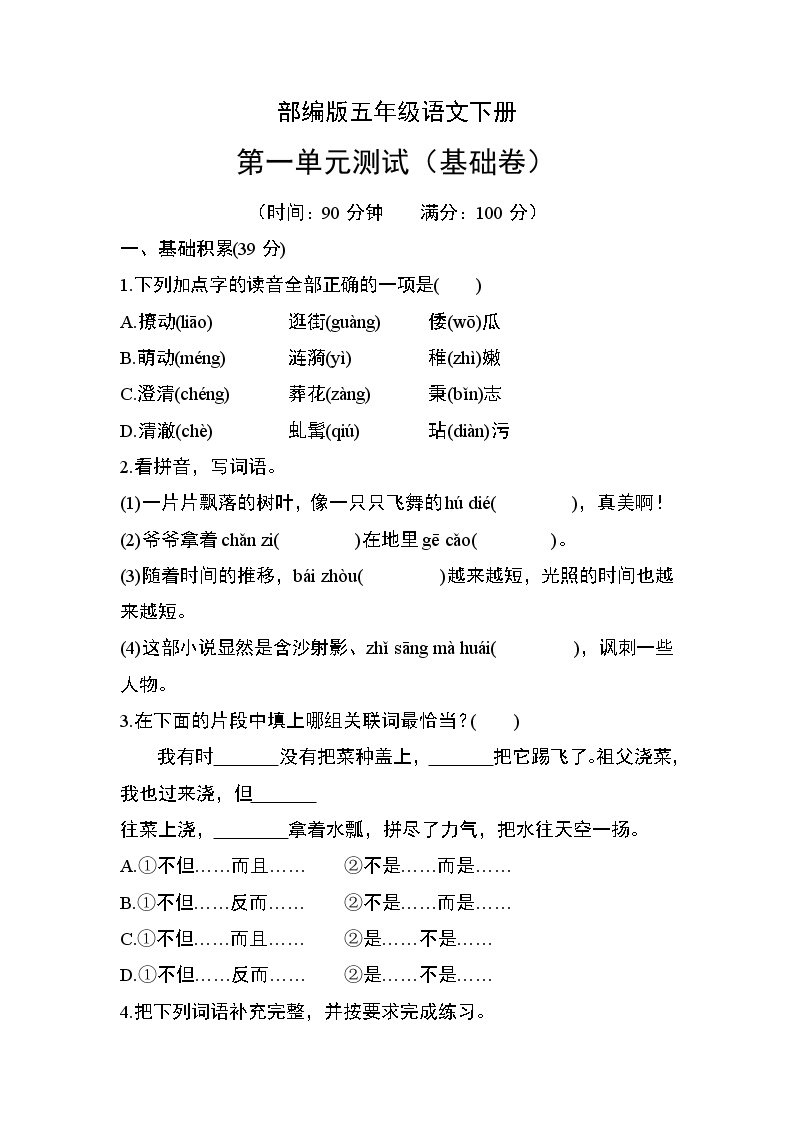 亲爱的家长朋友们,鸡娃题库为您精心准备了部编版小学五年级语文下册第一单元测试(基础卷)📚。这份试卷完全符合教学大纲要求,题目设计科学合理,能够有效检测孩子对第一单元知识的掌握程度。