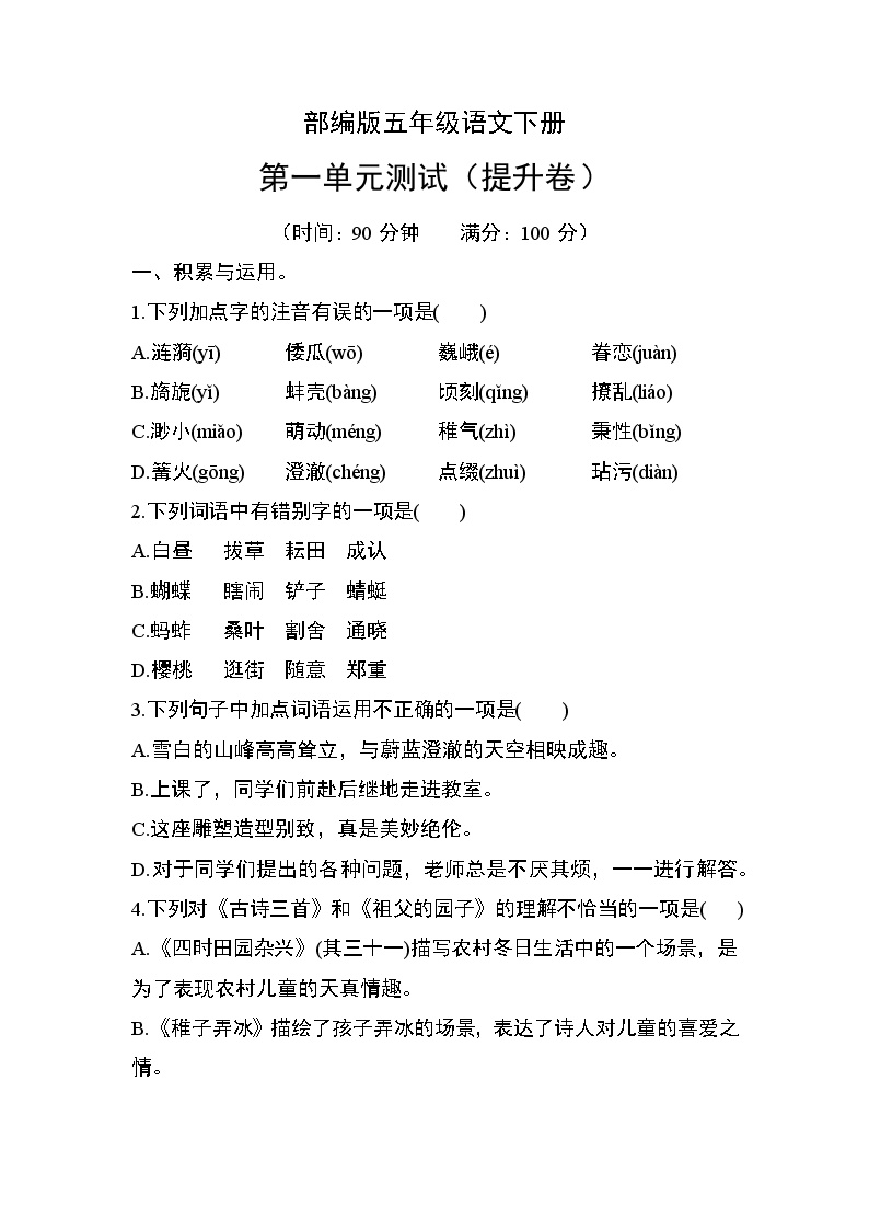 鸡娃题库为广大学子精心准备了部编版小学五年级语文下册第一单元测试(提升卷)🚀。这套试卷专为学有余力的学生设计,题目难度较高,旨在挑战学生思维极限,拓展语文能力边界。