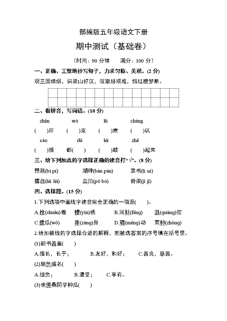 亲爱的家长朋友们,大家好!鸡娃题库(www.jiwatiku.cn)为您精心整理了部编版五年级语文下册期中测试(基础卷),试卷包含参考答案,支持高清打印,完全免费下载!