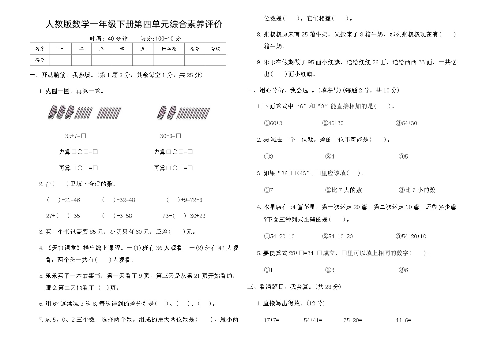 鸡娃题库(www.jiwatiku.cn)为您呈现第四份素养评价资源➕——人教版小学一年级数学下册第四单元综合素养评价卷含答案可打印免费下载。这份评价卷专注于加减法运算的素养深度评价,通过创新的题目设计,全面考察学生的运算理解、策略运用和问题解决能力。