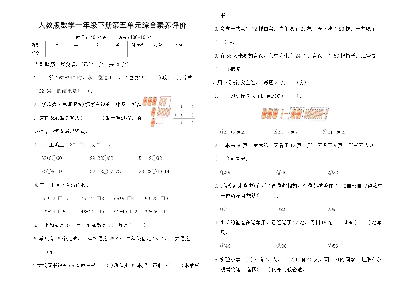 一年级数学下册第五单元综合素养评价卷含答案注重学生数学建模能力的评价,通过将实际问题转化为数学问题,运用数学工具解决问题,再回到实际情境验证结果的全过程评价,培养学生的数学建模思维,为未来的数学学习奠定基础。