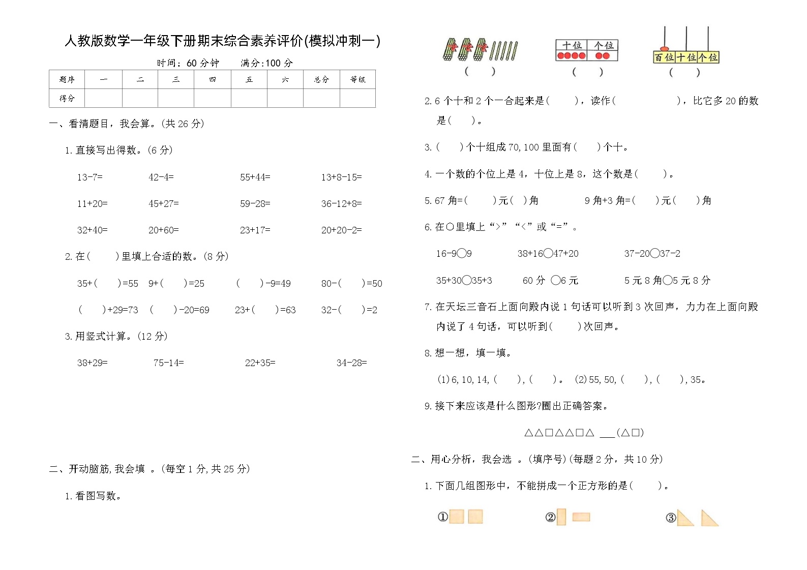 鸡娃题库(www.jiwatiku.cn)为您呈现冲刺阶段精品资源🚀——人教版数学一年级下册期末综合素养评价卷(模拟冲刺一)含答案。这份冲刺卷针对期末最后阶段设计,通过高强度的模拟训练,帮助学生实现最后的突破和提升。