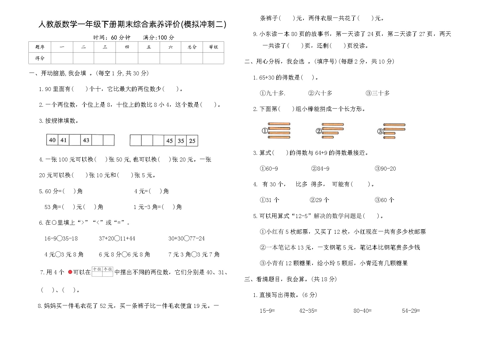 鸡娃题库(www.jiwatiku.cn)带来第五份冲刺精品📊——人教版数学一年级下册期末综合素养评价卷(模拟冲刺二)含答案。这份冲刺卷在前一套基础上进一步提升难度和综合性,为学生提供更高层次的挑战,确保期末考试的出色表现。
