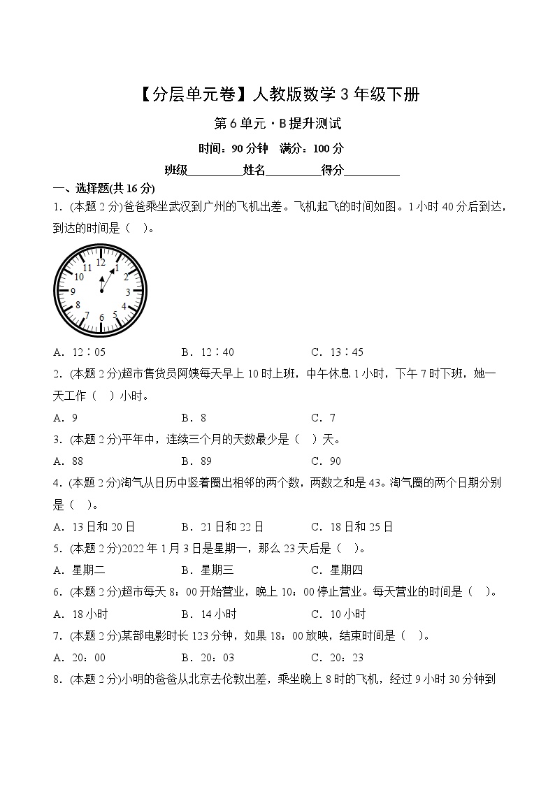 马上获取这份免费可打印的三年级数学第六单元B提升试卷,提升时间管理能力!