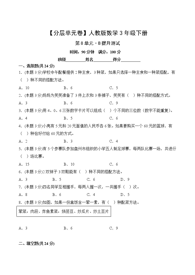 鸡娃题库推出人教版小学数学三年级下册第八单元B提升测试卷,针对数学广角——搭配问题进行思维深度拓展。这份试卷包含更具挑战性的排列组合和逻辑推理题目,适合想要提升数学思维能力的学生。我们提供高清可打印版本,配备详细解析,所有资源免费下载,培养卓越数学思维!