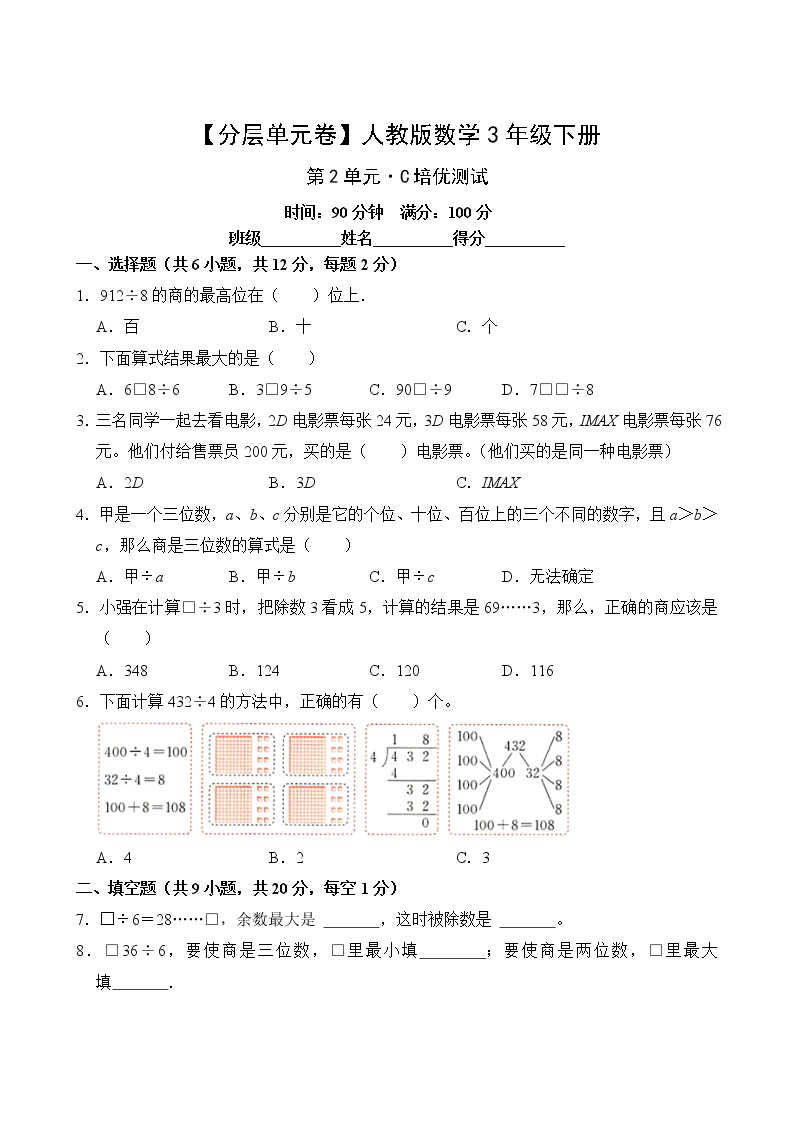 鸡娃题库推出人教版小学数学三年级下册第二单元C培优测试卷,专注于除数是一位数除法的精英级训练。这份试卷包含创新题型和深度思维题目,适合数学能力突出的学生。我们提供高清可打印版本,配备专家级解析,所有资源免费下载,培养数学顶尖人才!