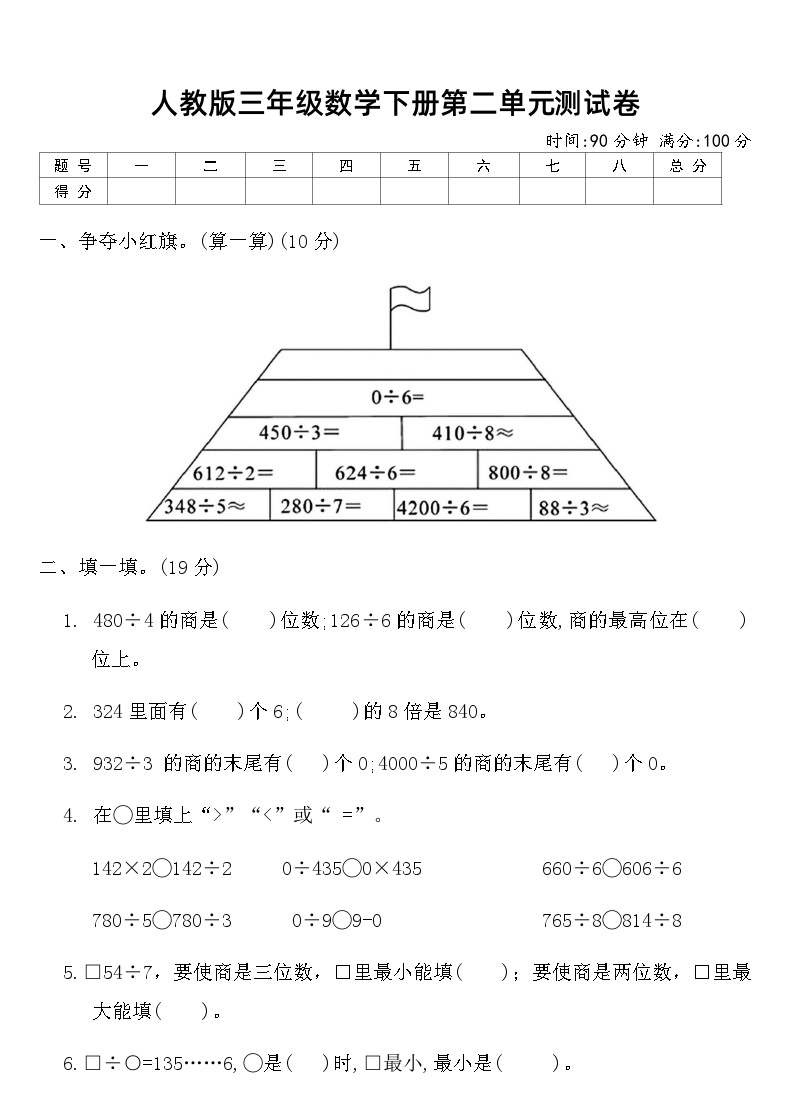 鸡娃题库为您推荐人教版小学三年级数学下册第二单元测试卷,这份试卷专门针对除数是一位数的除法单元设计。我们提供高清可打印版本,包含完整的参考答案,所有资源均可免费下载,帮助孩子夯实除法计算基础,提高数学运算能力。