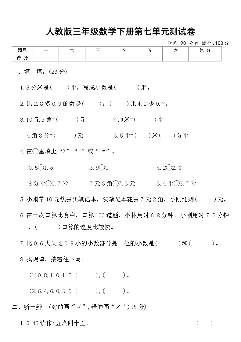 鸡娃题库推出人教版小学三年级数学下册第七单元测试卷,重点检测小数的初步认识程度。这份试卷题目设计循序渐进,注重概念理解。我们提供高清可打印版本,配有详细解析,所有资源均可免费下载,帮助孩子打好小数学习基础。
