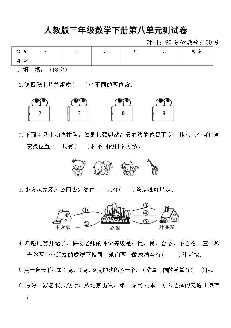 鸡娃题库为您提供人教版小学三年级数学下册第八单元测试卷,重点检测数学广角搭配问题的掌握情况。这份试卷题目设计有趣且富有挑战性。我们提供高清可打印版本,包含完整解题思路,所有资源均可免费下载,帮助孩子培养逻辑思维能力。
