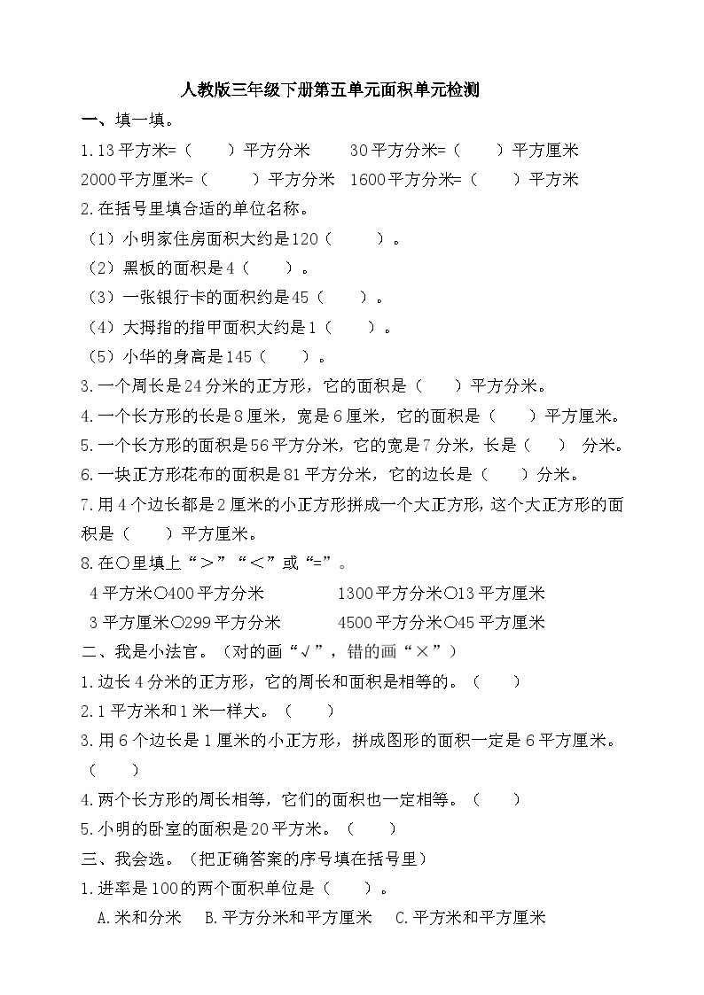 鸡娃题库为您呈现人教版小学三年级数学下册第五单元检测卷,重点检测面积概念和计算能力。这份试卷题目设计直观生动,我们提供高清可打印版本,配有详细解析,所有资源均可免费下载,帮助建立空间观念。
