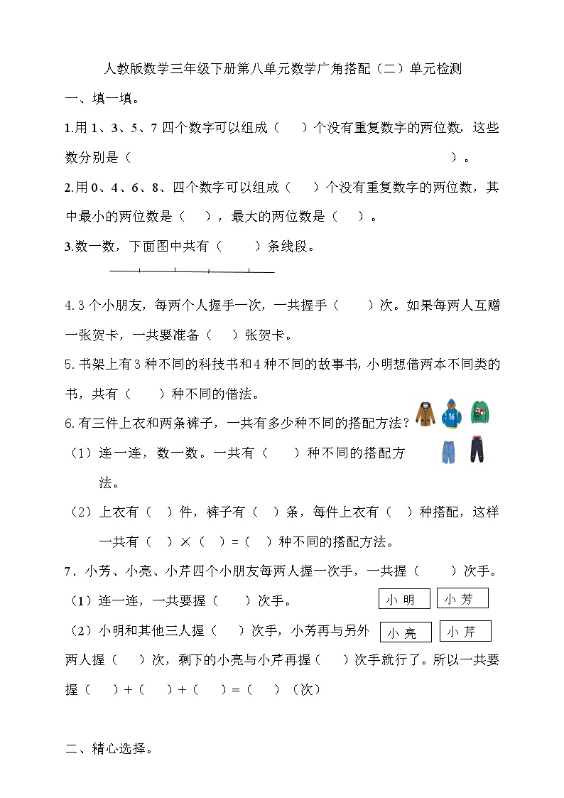 鸡娃题库为您提供人教版小学三年级数学下册第八单元检测卷,重点检测数学广角搭配问题。这份试卷题目设计有趣且富有挑战性,我们提供高清可打印版本,包含完整解题思路,所有资源均可免费下载,培养逻辑思维能力。
