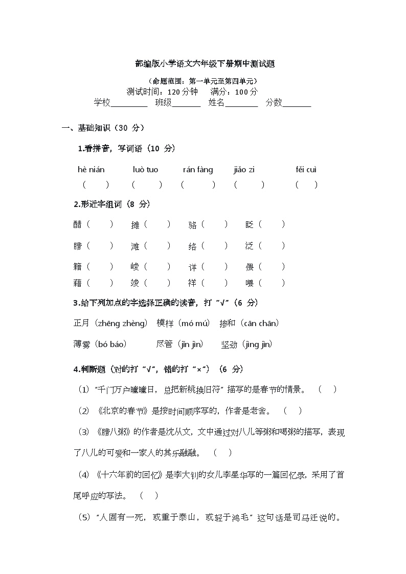 亲爱的家长朋友们,为您推荐一份优质的部编版小学语文六年级下册期中测试题!这份试卷内容全面,题型丰富,紧扣教材重点,适合孩子进行阶段性复习检测。题目设计科学,涵盖基础知识、阅读理解与写作等多个方面,能够有效帮助孩子巩固所学知识。