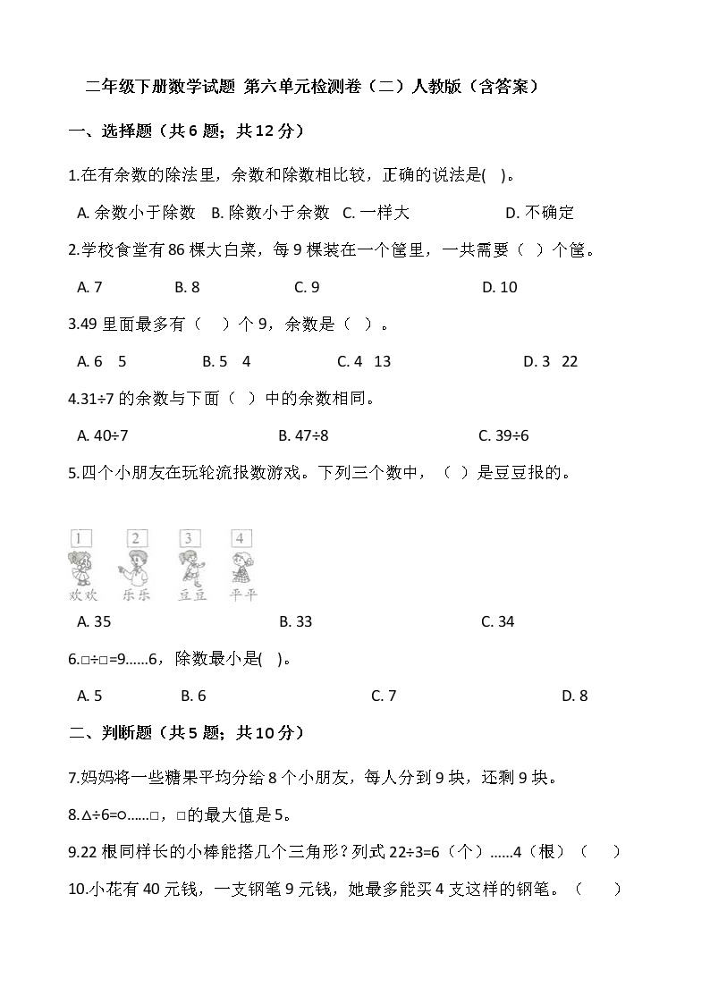 人教版小学二年级数学下册第六单元检测卷(二)含答案可打印免费下载资源为您带来新的学习支持。这个单元通常引入更多抽象数学概念,适合的练习材料能够帮助孩子更好理解。单元检测是学习过程中必不可少的环节,能够检验学习效果。