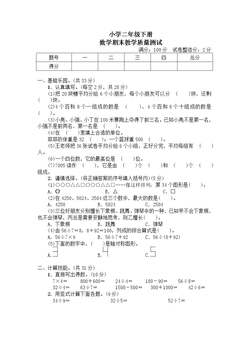 学习进入中期阶段,人教版小学二年级数学下册第五单元综合训练卷(二)含答案显得尤为重要。这个单元通常包含承上启下的重要内容,扎实掌握对后续学习影响重大。专业设计的训练卷帮助孩子巩固中期学习成果,提高数学水平。