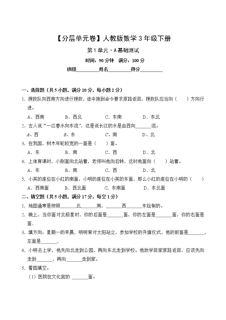 这份人教版三年级数学下册第一单元测试卷重点考查位置与方向的知识点。试卷包含填空题、选择题、判断题和应用题等多种题型,全面覆盖单元核心内容。题目难度适中,既有基础练习也有适当拓展,能够有效检验孩子对知识的掌握程度。