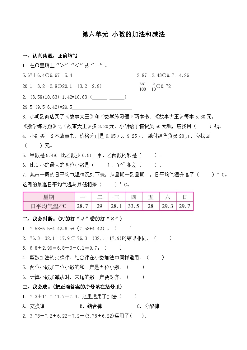 本单元试卷重点训练小数加减法的计算技巧和应用能力。题目设计遵循循序渐进的原则,从简单的一位小数加减到复杂的多位小数运算,逐步提升计算难度。试卷中包含大量实际问题,让孩子在解决现实问题的过程中掌握小数运算的方法。