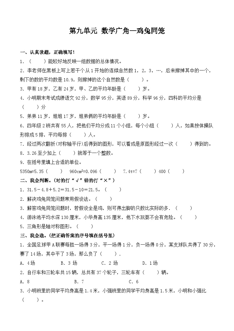 鸡娃题库分享人教版四年级数学下册第九单元数学广角——鸡兔同笼提升卷免费下载资源,这份高清可打印试卷含答案,专注于培养孩子的逻辑思维和问题解决能力。鸡兔同笼问题是经典数学思维训练题,能够有效提升孩子的推理能力。