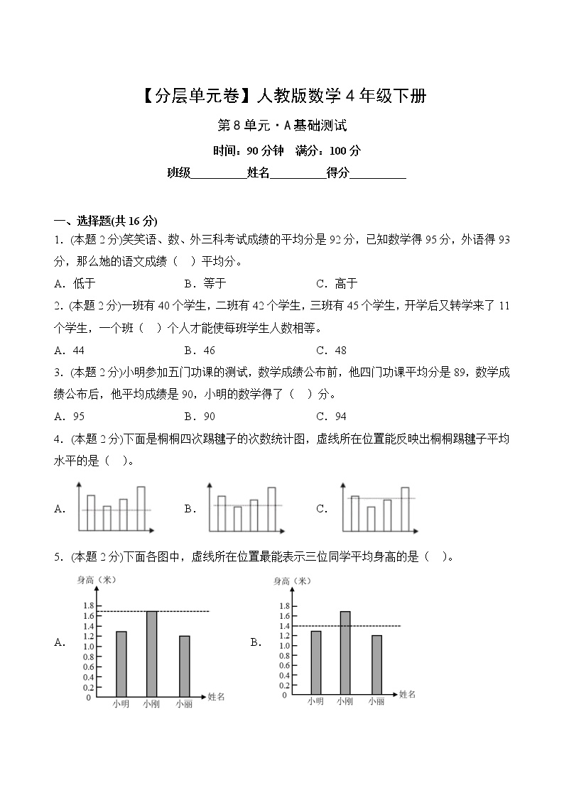 📒 人教版四年级数学下册第八单元【A基础】测试卷独家分享