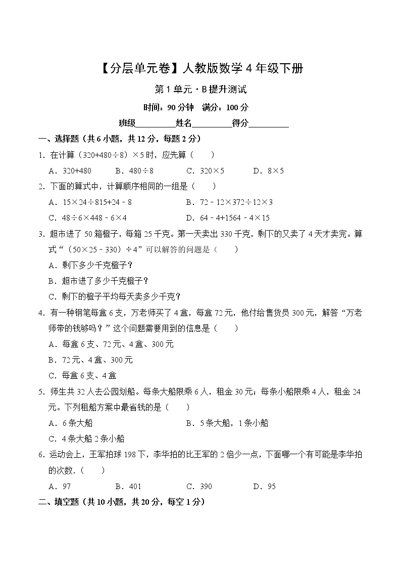 🚀 人教版四年级数学下册第一单元【B提升】测试卷(含答案)免费下载