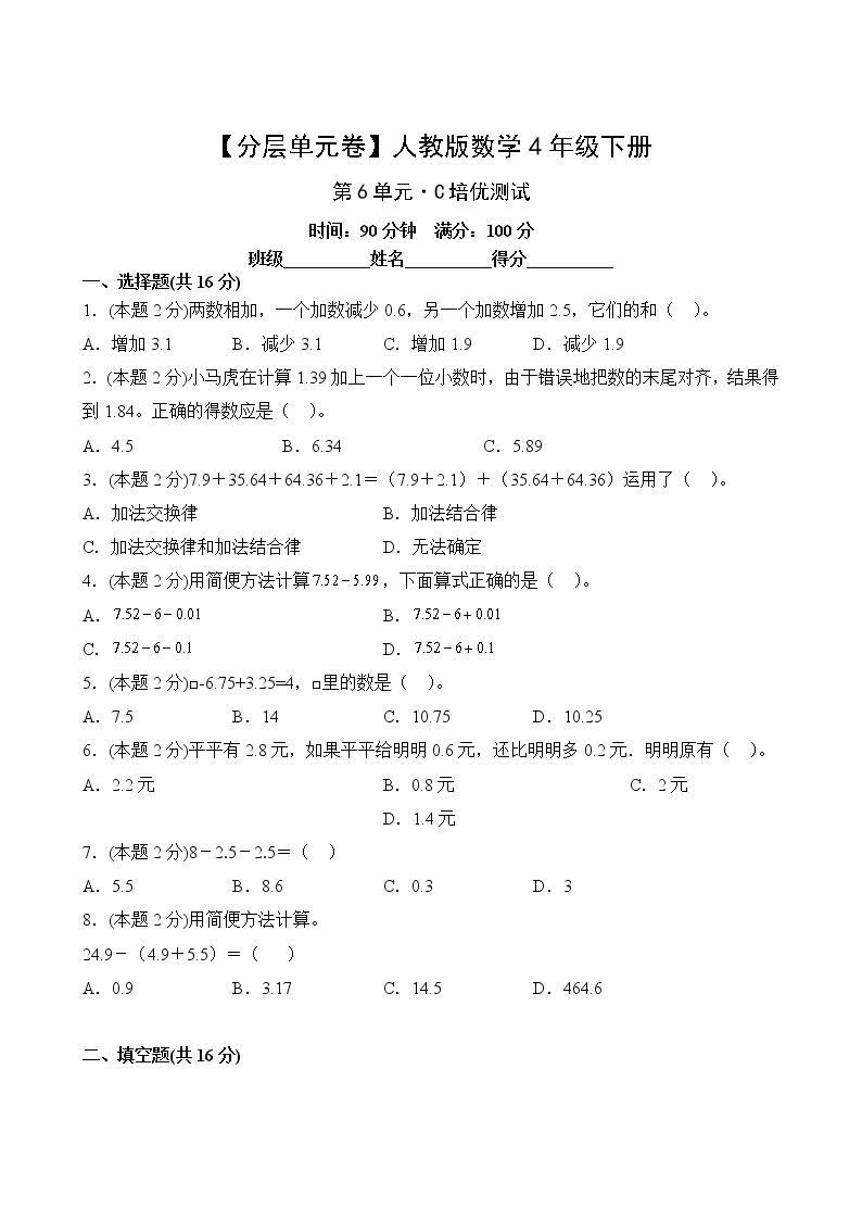人教版四年级数学下册第六单元【C培优】测试卷正式发布!本试卷针对第六单元数学内容专门设计,旨在帮助学生深入理解数学概念,提升解题能力。