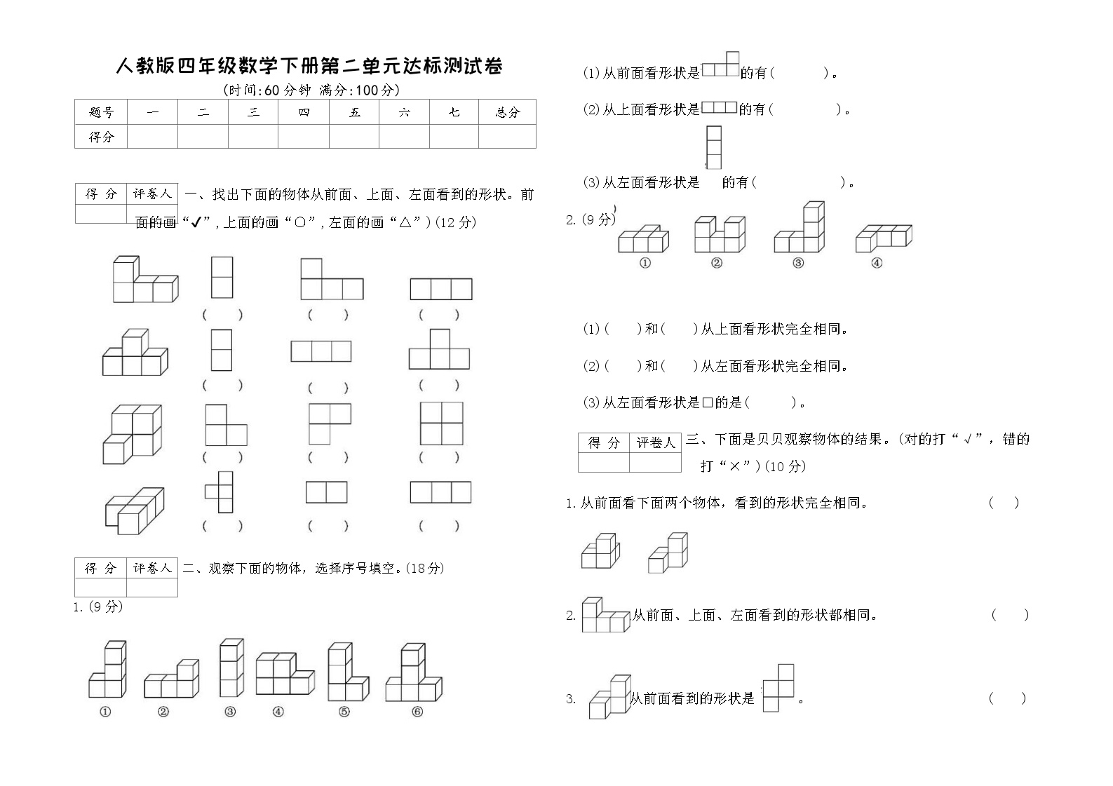 鸡娃题库为您发布人教版四年级数学下册第二单元测试卷,聚焦观察物体内容。高清可打印的PDF格式,附带答案,免费下载,助力空间想象能力培养。