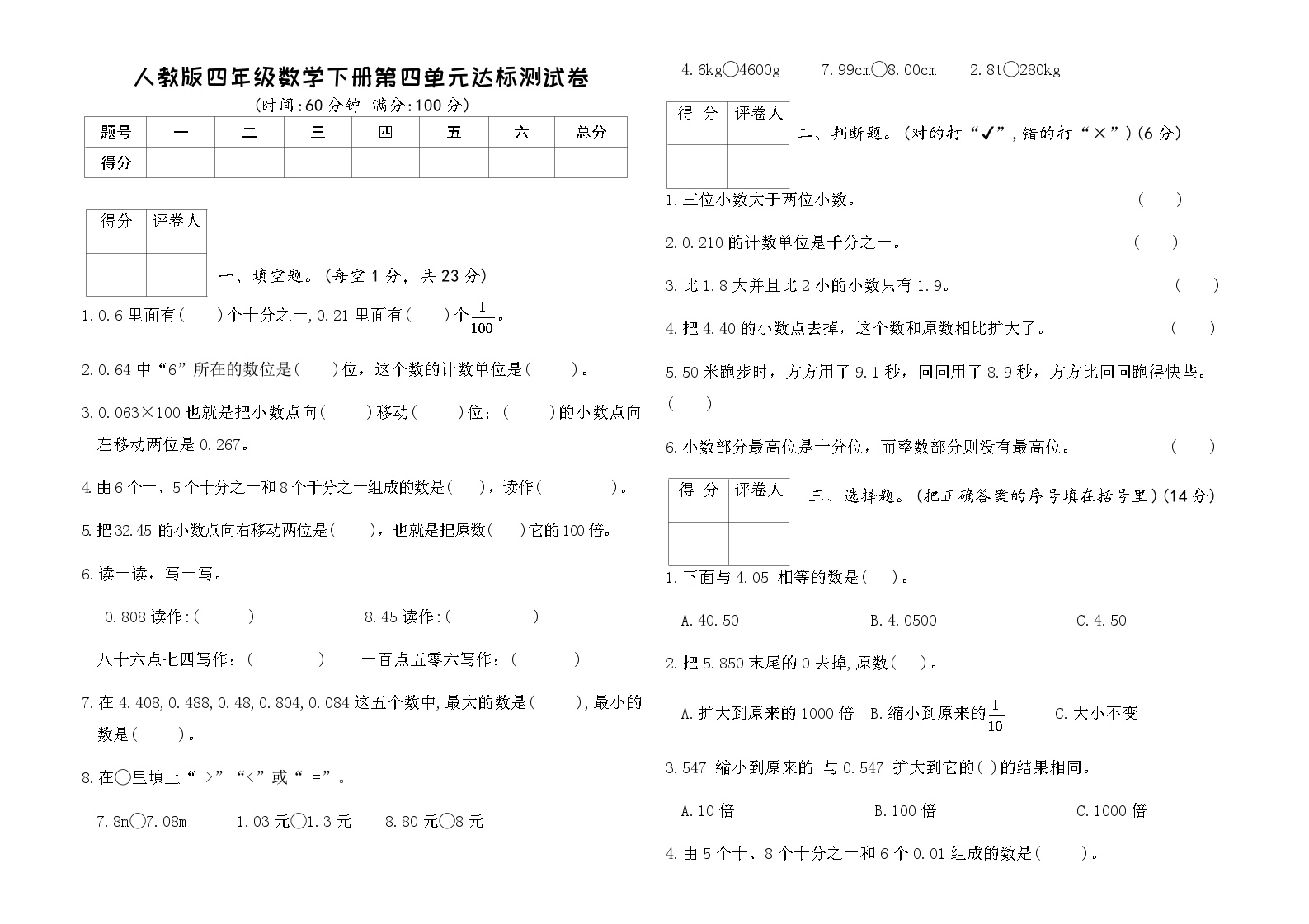 为您带来人教版四年级数学下册第四单元小数的意义和性质测试卷。鸡娃题库独家提供,高清排版,支持免费下载打印,帮助孩子迈好小数学习的第一步。