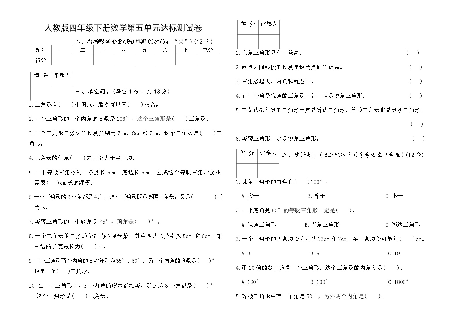 鸡娃题库发布人教版四年级数学下册第五单元三角形测试卷,附带标准答案。本资源专为小学四年级学生设计,高清可打印,免费下载使用。