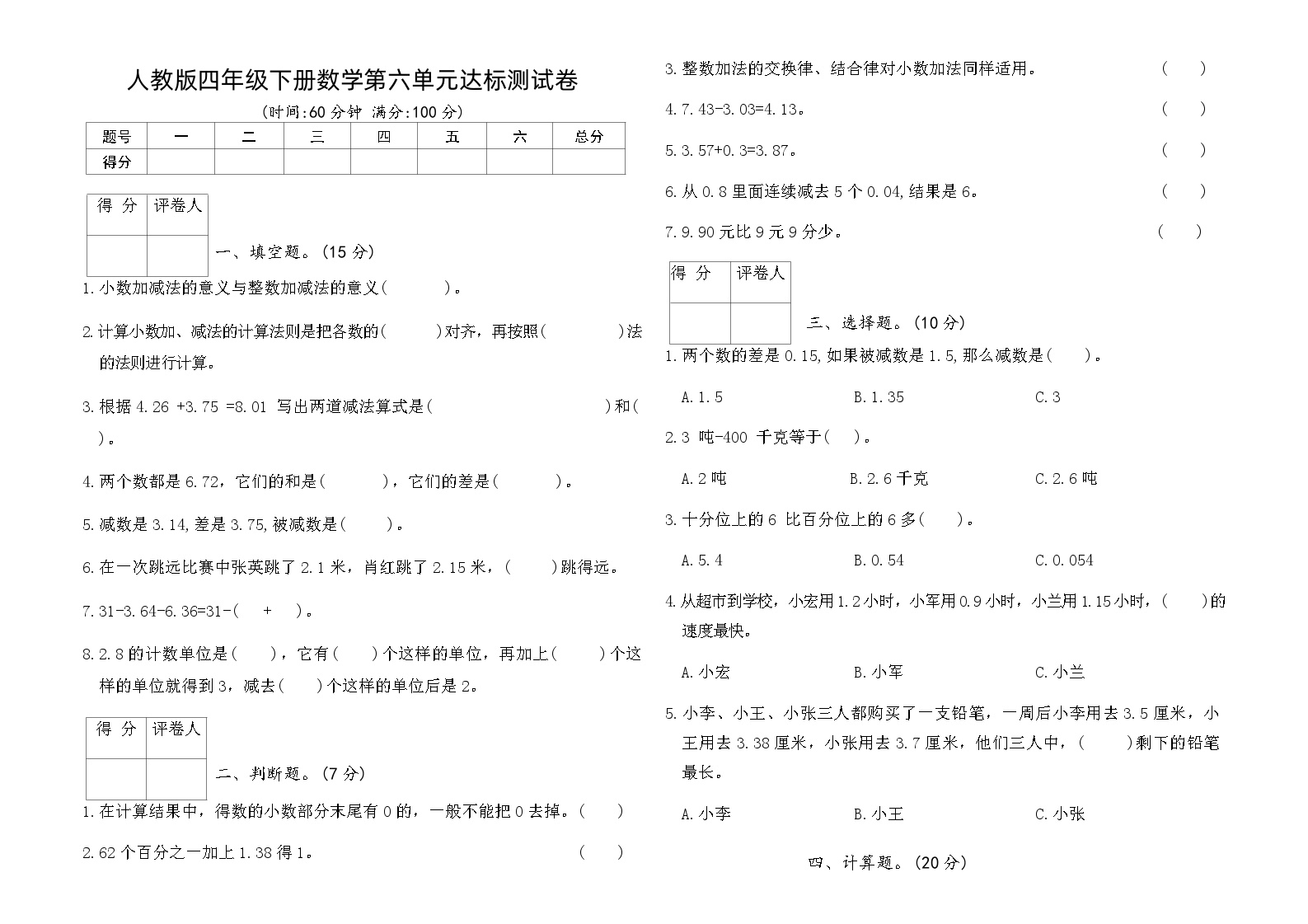 全新上线!人教版四年级数学下册第六单元小数的加法和减法测试卷已在鸡娃题库开放下载。PDF格式高清无水印,打印效果出色,完全免费。
