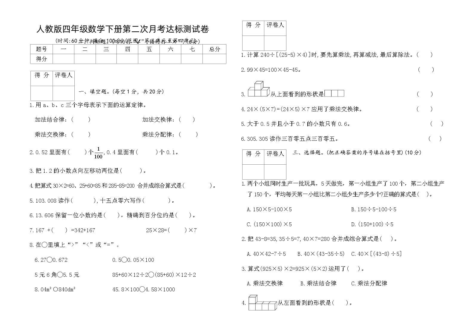 试卷设计充分考虑四年级学生的认知特点,题目形式多样,既有基础练习,又有拓展提升,能够全面检测学生的学习效果。