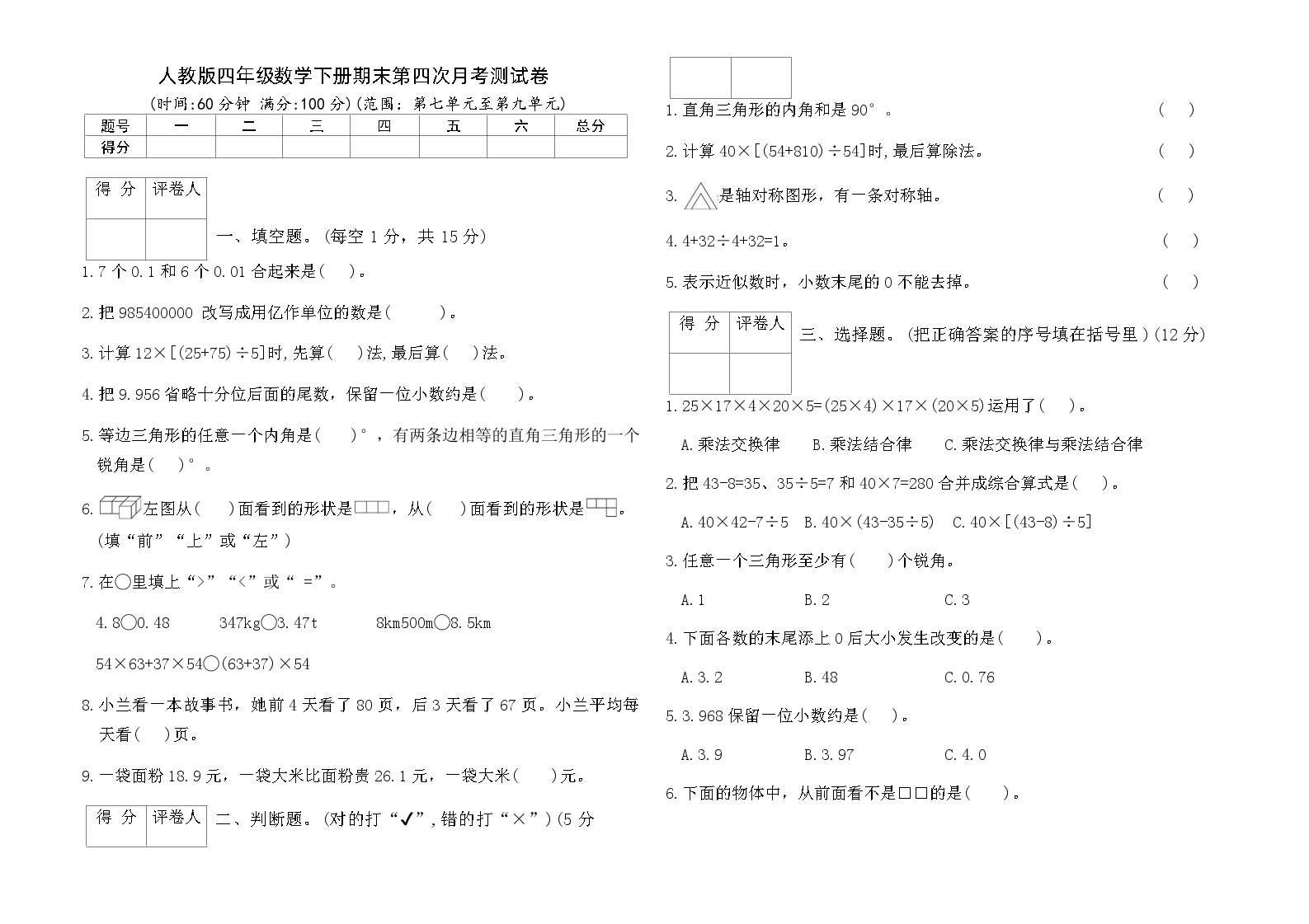 人教版四年级数学下册第四次月考达标测试卷完整呈现,包含第七、八、九单元综合内容。本试卷作为学期末的重要检测工具,全面覆盖下册重点难点。