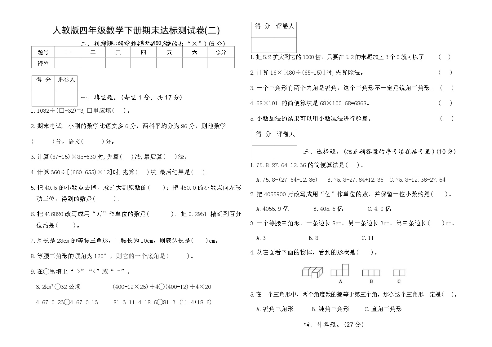 人教版小学四年级数学下册期末达标测试卷(二)重磅登场,作为期末复习的重要辅助材料。本试卷在延续第一套试卷优势的基础上,进一步优化题目设计,增强应用性题目的比重。