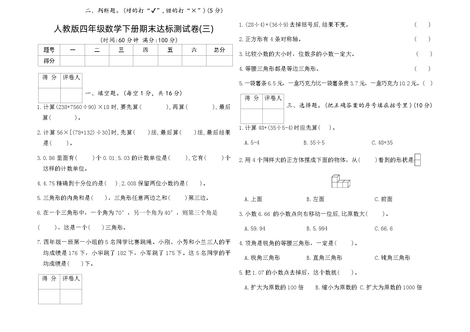 人教版小学四年级数学下册期末达标测试卷(三)压轴呈现,作为期末复习的终极检测工具。本套试卷在前两套的基础上进行深度优化,题目设计更具挑战性,更适合学有余力的学生使用。