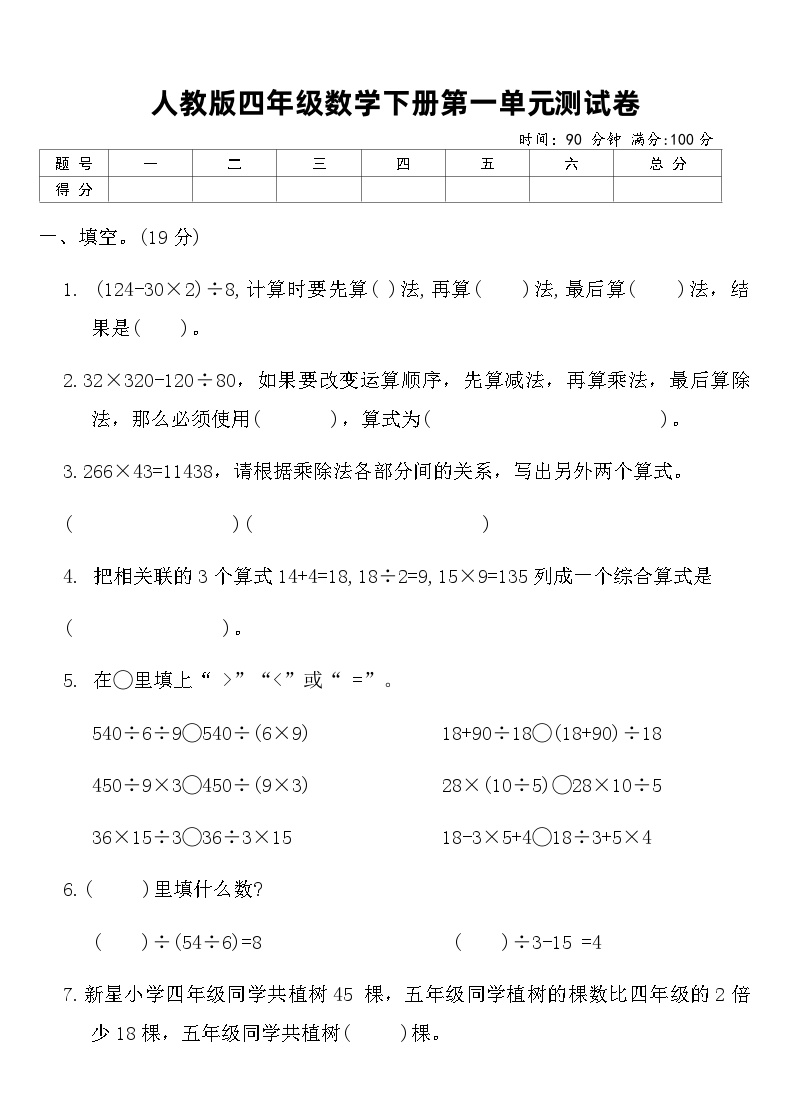 四年级数学下册第一单元测试卷是检测学生掌握四则运算基础知识的重要工具。本套测试卷完全按照人教版教材编写,涵盖加减乘除的综合运算内容,帮助孩子巩固数学基础,提升计算能力。