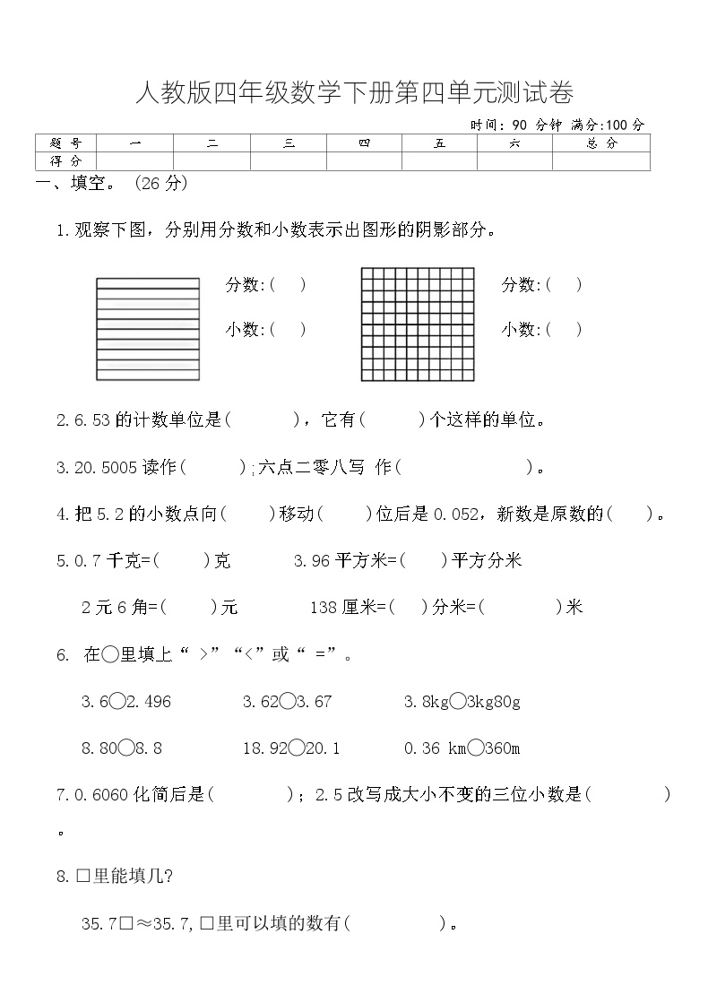 免费获取第四单元小数测试卷,帮助孩子顺利掌握小数知识,为后续学习打下坚实基础!🌠