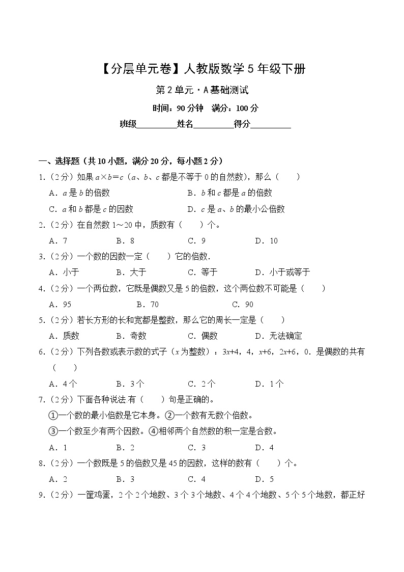 五年级数学下册第二单元测试卷聚焦因数与倍数的核心概念,这是数论知识的基础入门单元。试卷内容完全匹配人教版教学进度,帮助学生建立完整的知识体系。