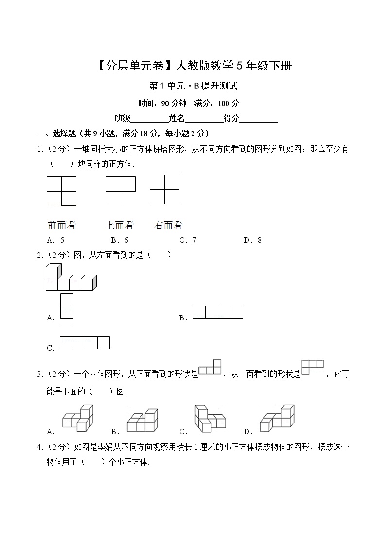 五年级数学下册第一单元B提升测试卷专为观察物体能力进阶设计,适合已经掌握基础知识的学有余力学生。这份提升卷通过更具挑战性的题目,深度训练学生的空间想象和几何直观能力。