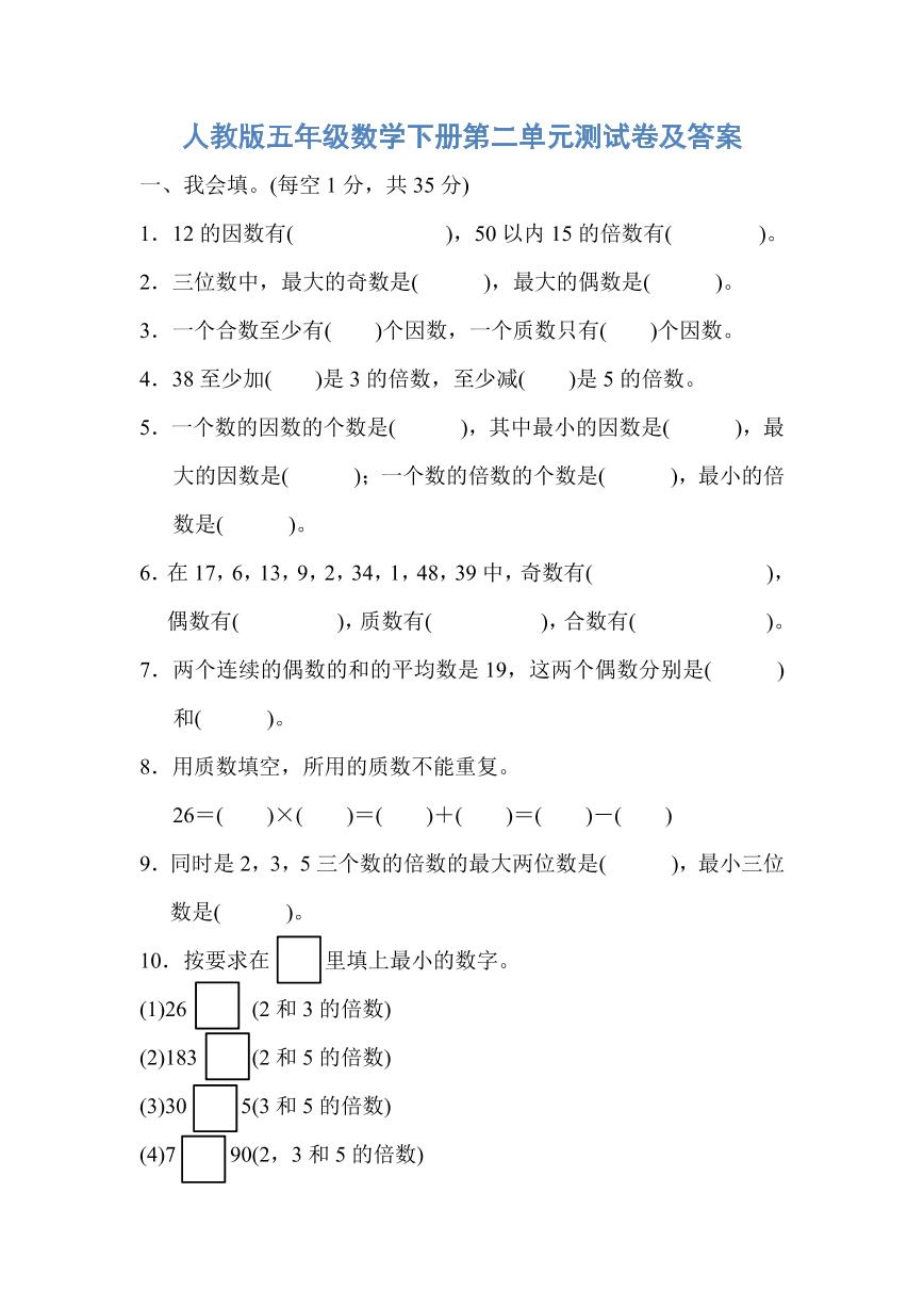 这份人教版小学五年级数学下册第二单元测试卷专注于因数与倍数的核心概念。作为承上启下的关键单元,本卷帮助学生构建数论知识体系,高清可打印的格式便于反复练习,巩固基础。