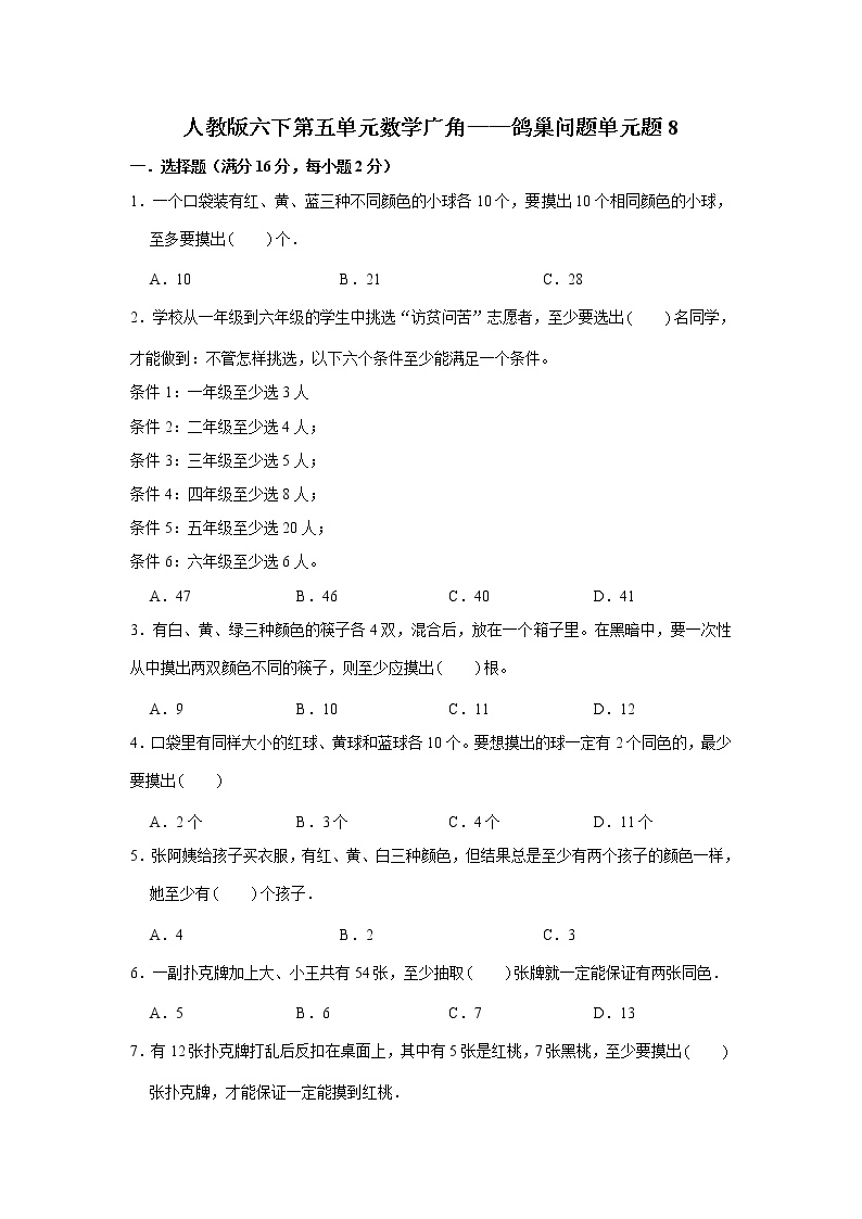 鸡娃题库为您整理全套人教版六年级数学单元卷,从第一单元到第五单元检测卷(八)全部可用。所有资源保持统一高质量标准,免费提供打印,方便您系统性地组织复习计划,全面跟踪学习进度。