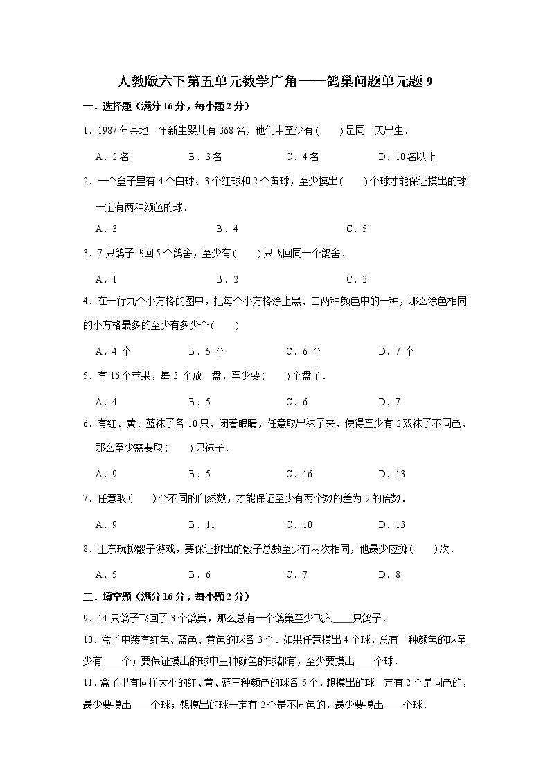 人教版小学六年级数学第五单元检测卷(九)围绕圆的相关知识展开,这是几何学习的重要组成部分。试卷题目设计巧妙,既有基础概念题,也有综合应用题,适合不同水平的学生使用。🔵