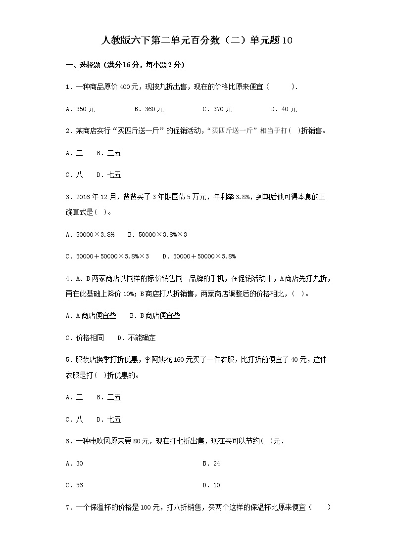 人教版小学六年级数学第二单元检测卷(十)是一份精心编写的学习资料,专门针对第二单元的教学内容设计。试卷包含多种题型和难度层次,配有详细的答案解析,非常适合学生进行单元复习和自我检测。这份资源是家长辅导孩子数学学习的得力助手,能够帮助孩子更好地掌握分数乘法的相关知识点。✨