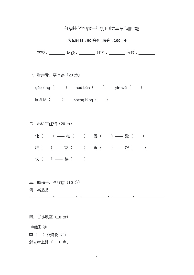 亲爱的家长们,鸡娃题库为您带来统编版小学语文一年级下册第三单元测试题🎯。这套测试题含完整答案,高清可打印,是检验第三单元学习效果的理想选择。