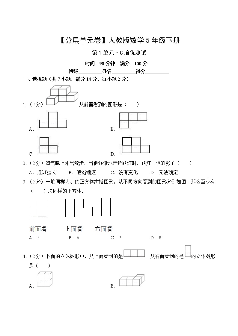 五年级数学下册第一单元培优测试卷聚焦观察物体与几何图形的深入认知。试卷设计遵循人教版教材大纲,融入拓展性思维训练,适合学有余力的学生挑战自我。